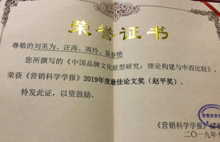 《营销科学学报》(JMS)是代表着中国营销科学的最新和最高学术水平的权威书刊,中国营销科学学术年会已经成为我国市场营销学界最高级别的学术会议,被誉为营销界的奥斯卡。每届学术年会都会评选学报年度最佳论文,即由《营销科学学报》的所有编委投票选出。以往这一殊荣往往被清华大学、复旦大学、武汉大学等营销学科强势院校获得,而今年的最佳论文奖花落湖北文理学院。创新创业教育学院刘英为博士的论文《中国品牌文化原型研究:理论构建与中西比较》获得《营销科学学报》年度最佳论文(赵平奖),与此同时,她还收到Journal of Contemporary Marketing Science英文期刊的版面邀请。这充分体现太阳集团城网站2018人才引进工作的成效和创新创业教育学院师资建设方面的成就,也是对创新创业教育学院教师教学与科研能力的充分肯定。