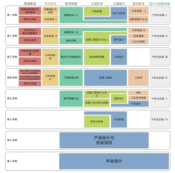 1.通过课程改革,设置模块化、贯通式课程体系,借鉴国内外高校工程教育先进教学理念,重构数学、科学、工程科学、设计和通识深度融合的课程体系,新建一批多学科交叉课程。为学生设计涵盖基础理论—专业实践—综合实训递进式项目化全新专业课程,将专业课程以项目的形式教授,学生则通过完成一个个的项目提高设计思维、工程思维和系统思维等思维水平;