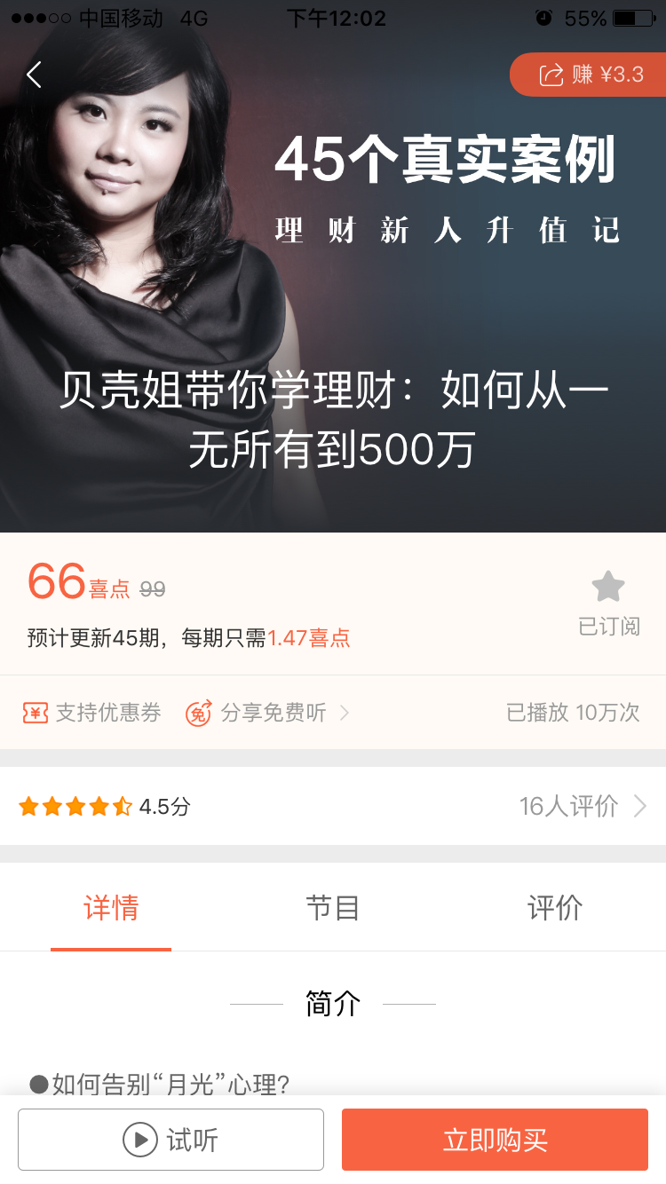 2017年2月底在中国排名第一的网络电台喜玛拉雅开设个人专栏《贝壳姐带你学理财》,两周内有10万人次点击,获得原《第一财经日报》总编秦朔、中国CIIA之家理事会首任理事长袁和平的推荐。