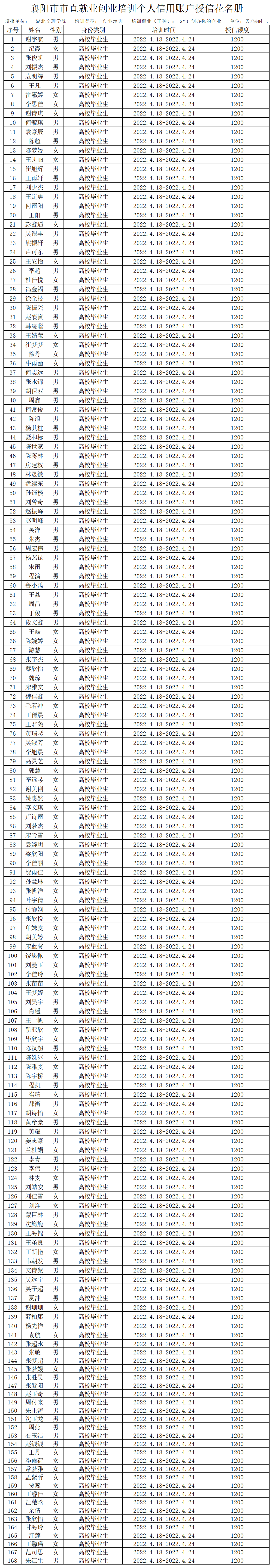 现将拟授信人员花名册予以公示,公示期为5天,从2022年4月11日至4月15日止。公示期间,社会公众对拟授信人员有异议的,可以通过电话、信件等方式向襄阳市人力资源和社会保障局反映,电话:0710-3607071;来信地址:襄城区檀溪路160号襄阳市人力资源和社会保障局就业促进与失业保险科;邮政编码:441021。