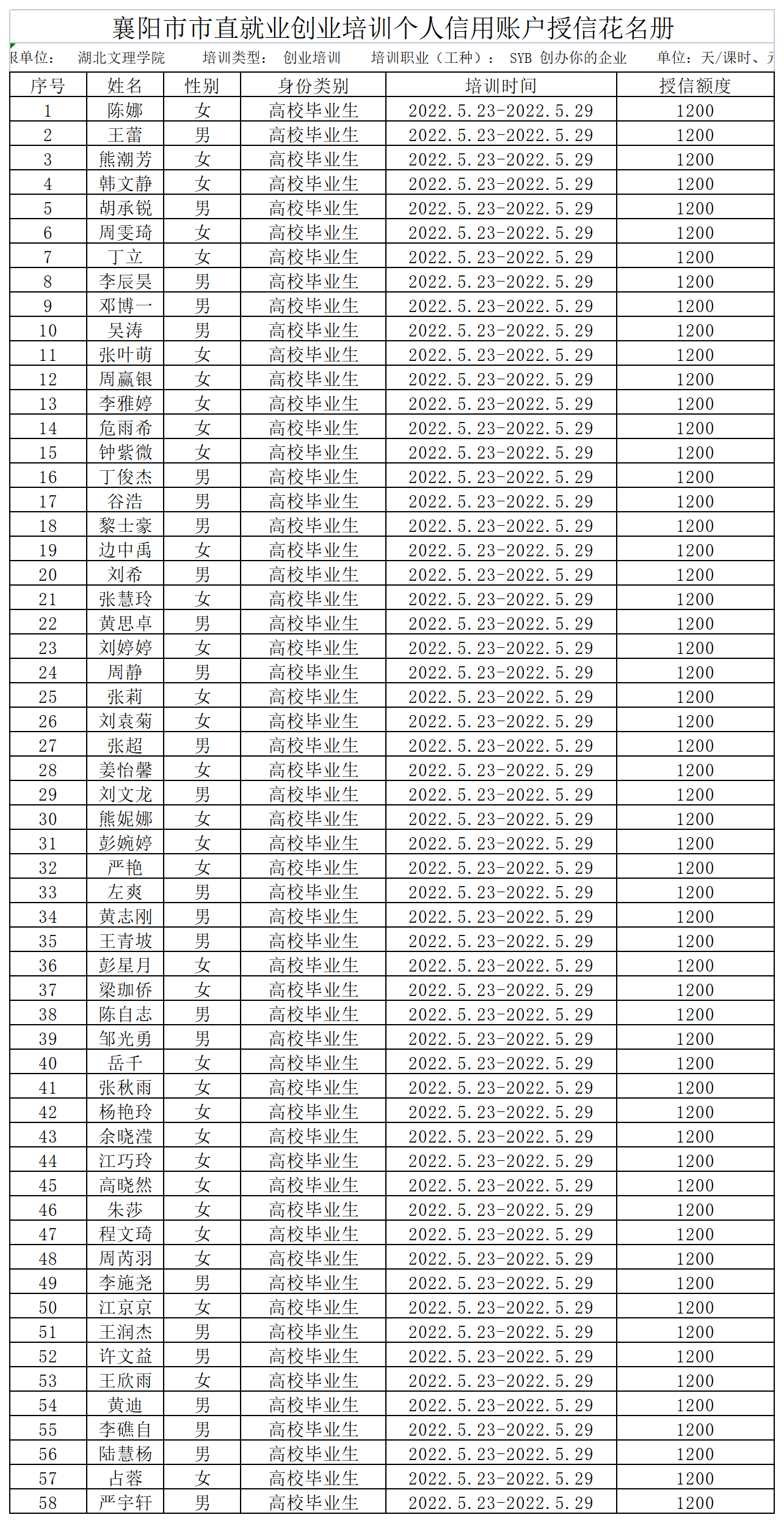 根据《省人社厅太阳集团城网站2018印发〈湖北省就业创业培训补贴管理办法〉的通知》(鄂人社发〔2018〕64号)、《市人社局市财政局太阳集团城网站2018印发〈襄阳市市直就业创业培训个人信用账户管理实施试行办法〉的通知》(襄人社发〔2019〕133号)和《市人社局太阳集团城网站2018实施〈襄阳市市直就业创业培训个人信用账户管理实施试行办法〉有关事项的通知》(襄人社发〔2019〕139号)、《湖北省人力资源和社会保障厅太阳集团城网站2018实施“马兰花计划”的通知》(鄂人社函〔2021〕147号)文件规定,市劳动就业管理局对湖北文理学院参加就业创业培训学员纸质个人信用账户资料进行了审核,湖北文理学院参加创业培训58人,符合授信条件58人,拟按每人1200元标准给予授信,合计授信6.96万元。